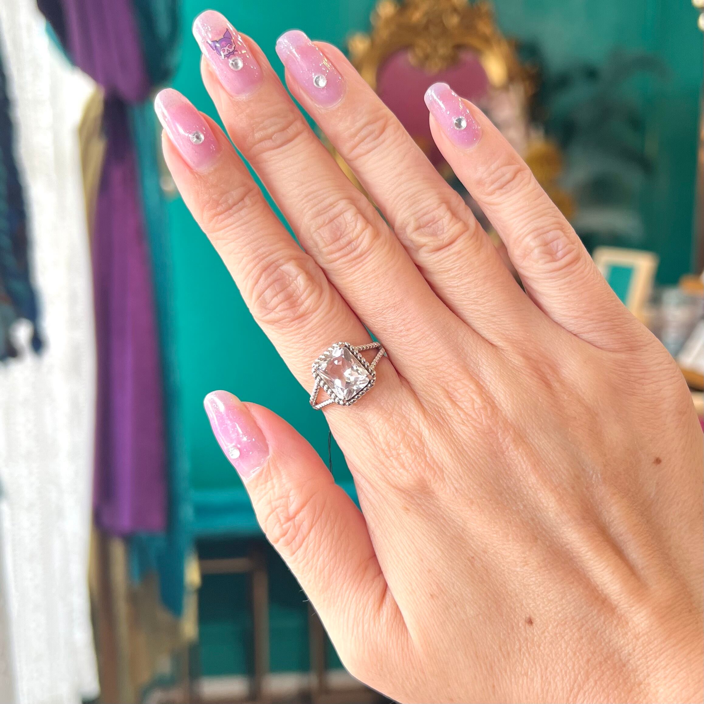 ※リングはフリーサイズとなっておりますが、一気に広げたり縮めたりすると石が外れてしまいますので、石が外れないように抑えながら慎重にサイズ調節を行ってください。